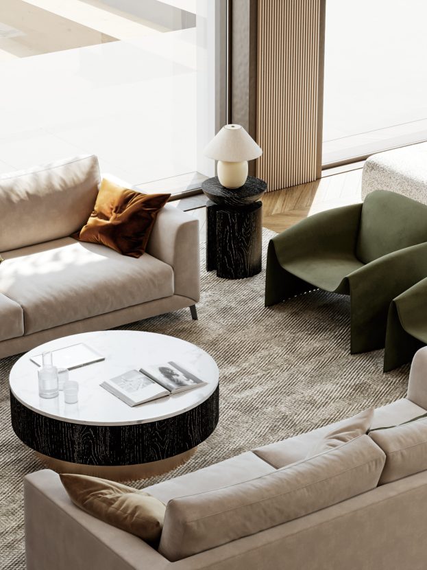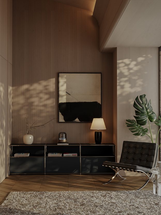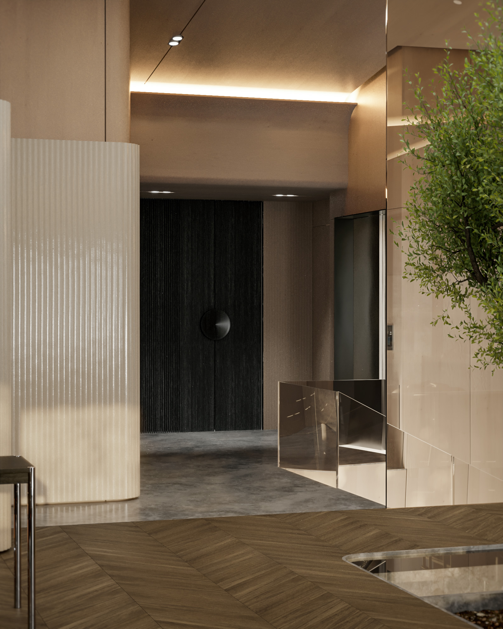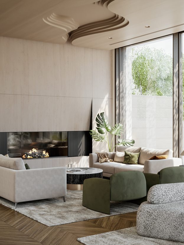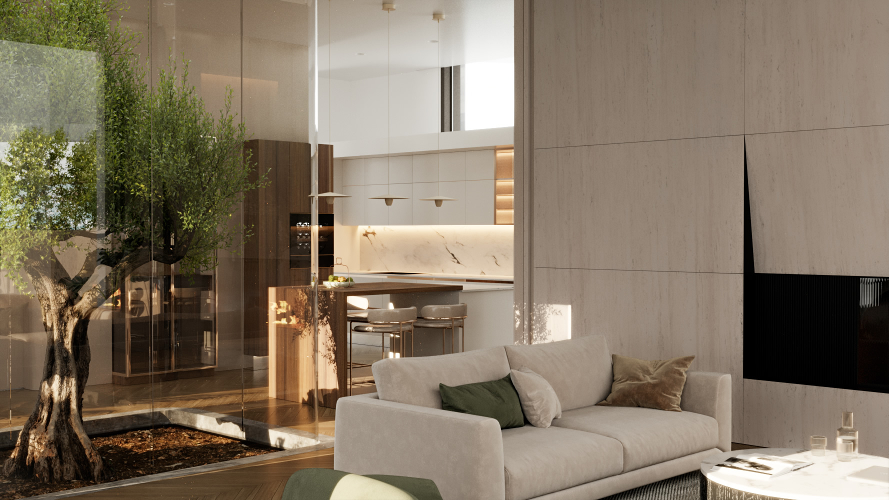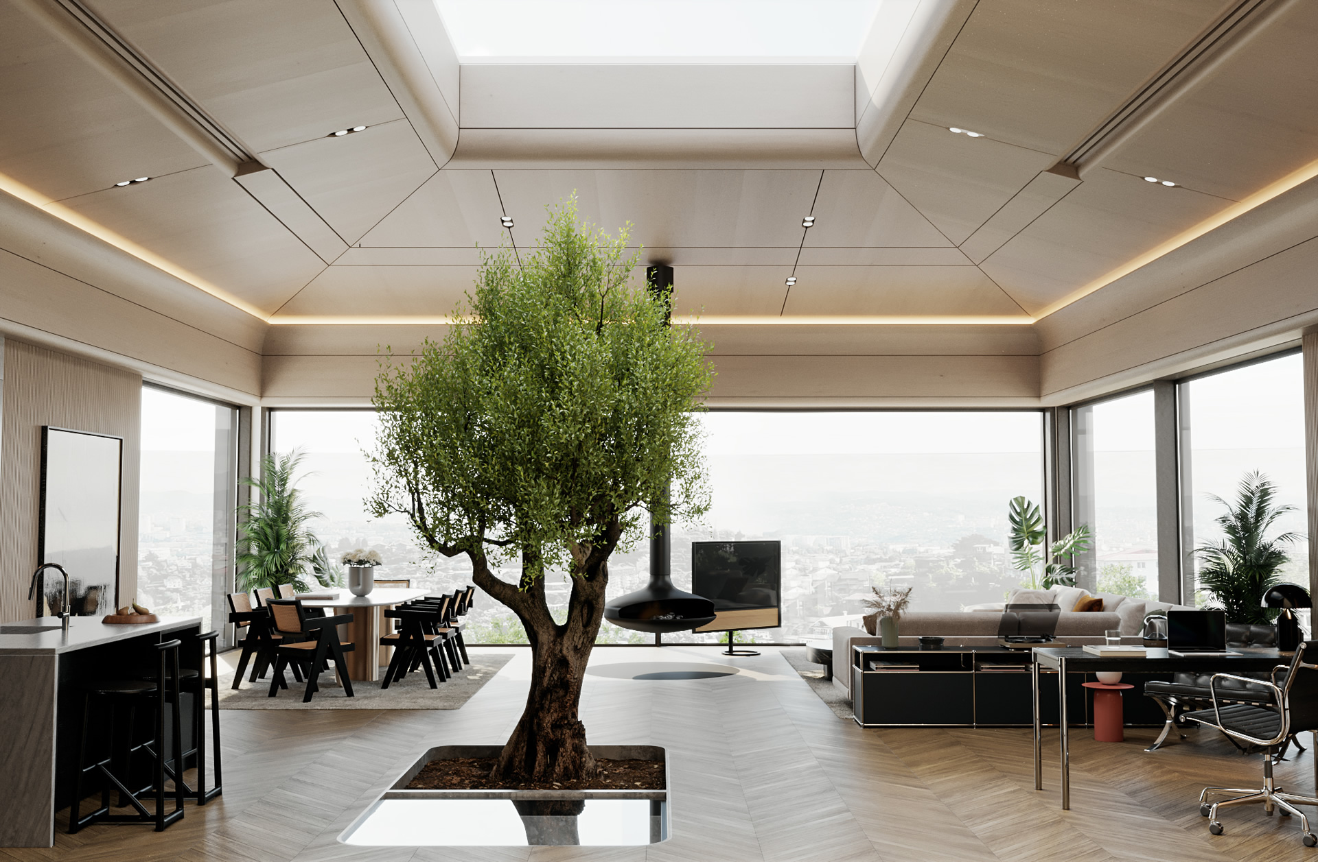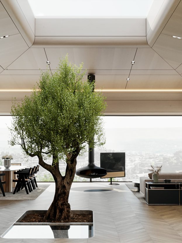 İç mekândaki zeytin ağacı, tasarımın merkezinde yer alarak mekâna güçlü bir ruh katıyor.