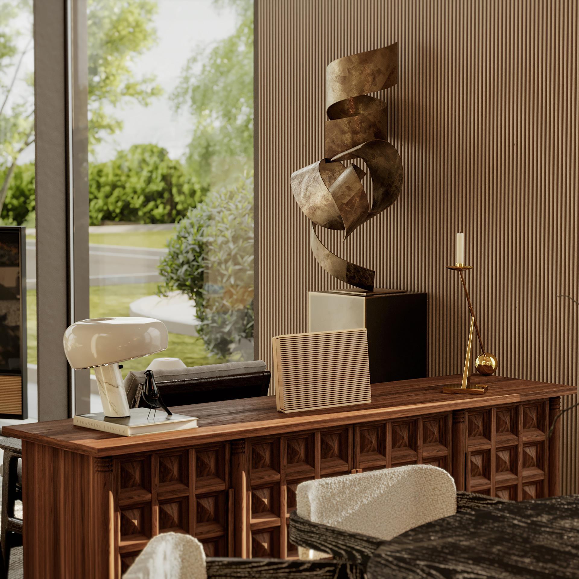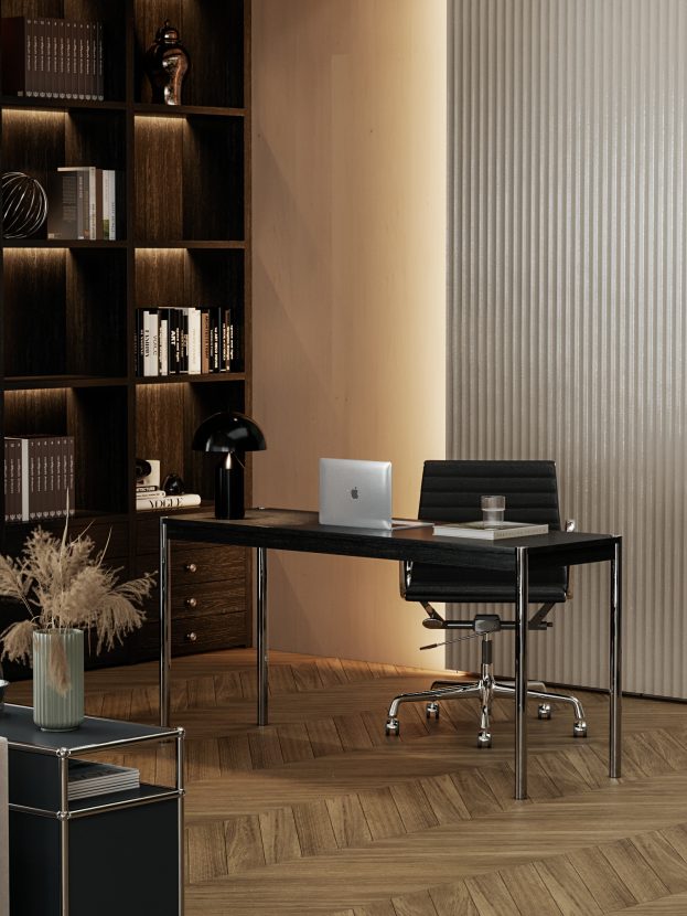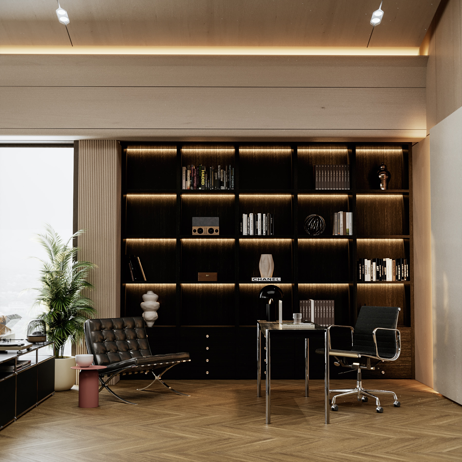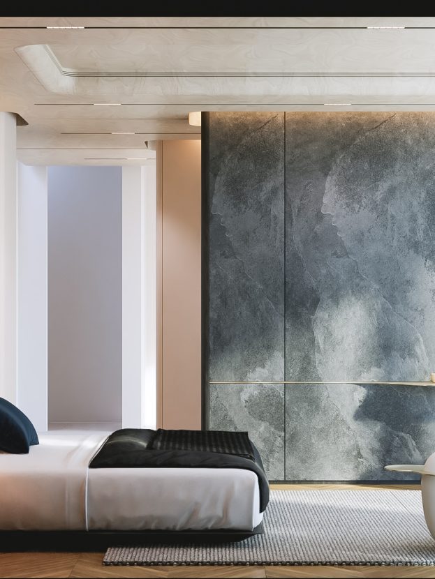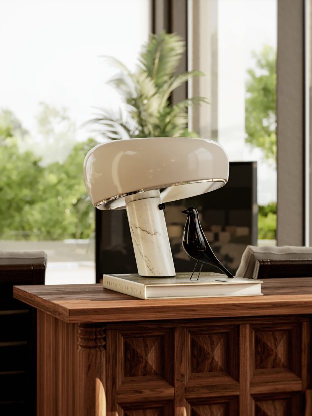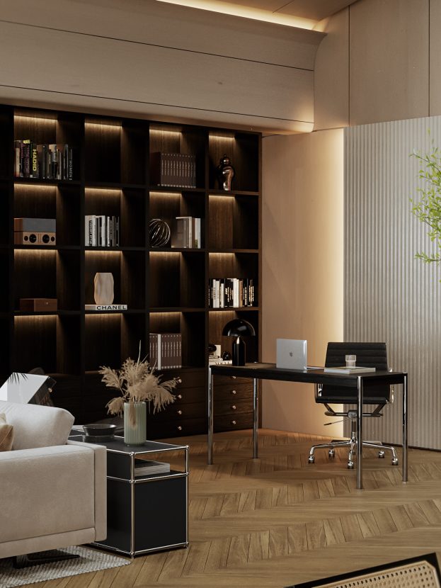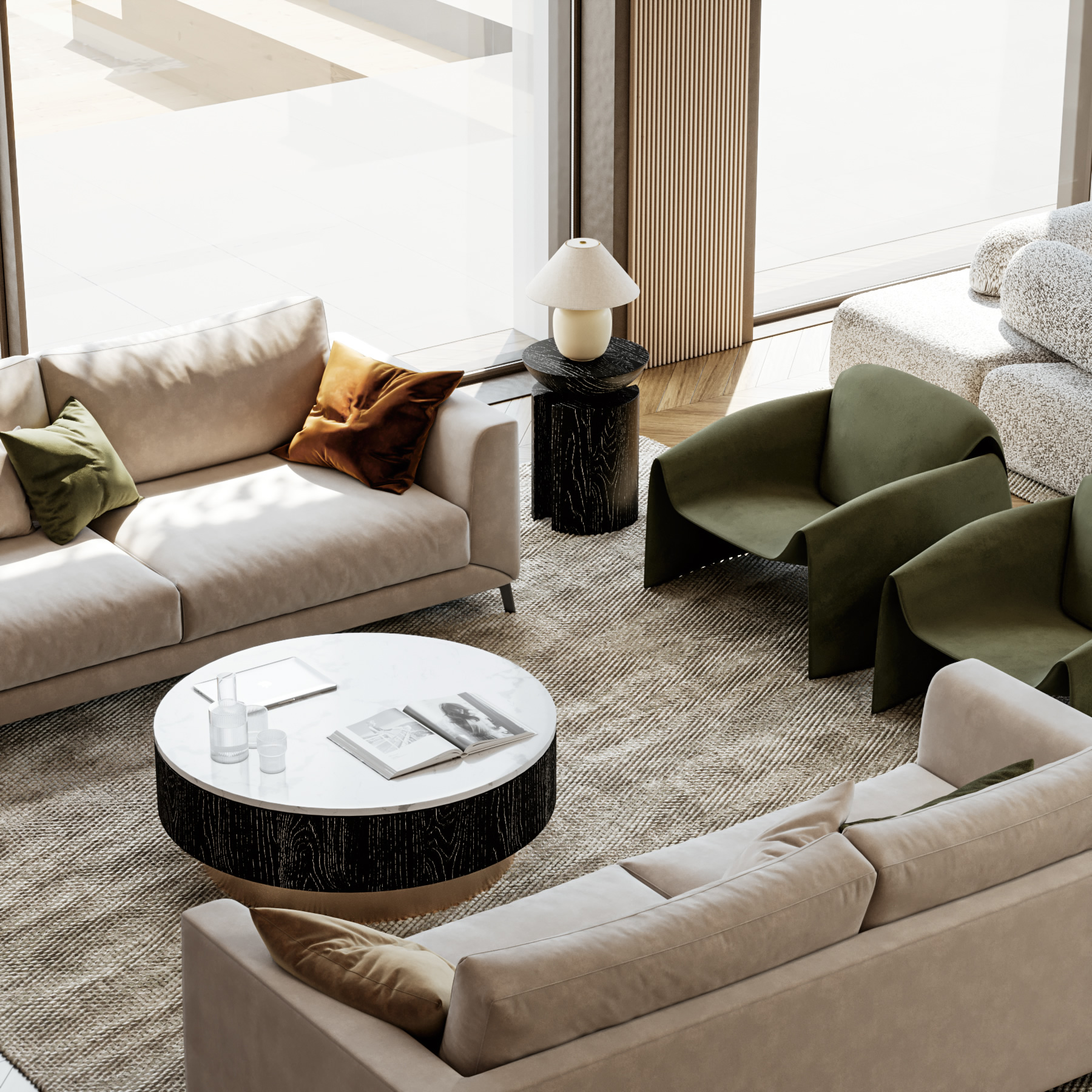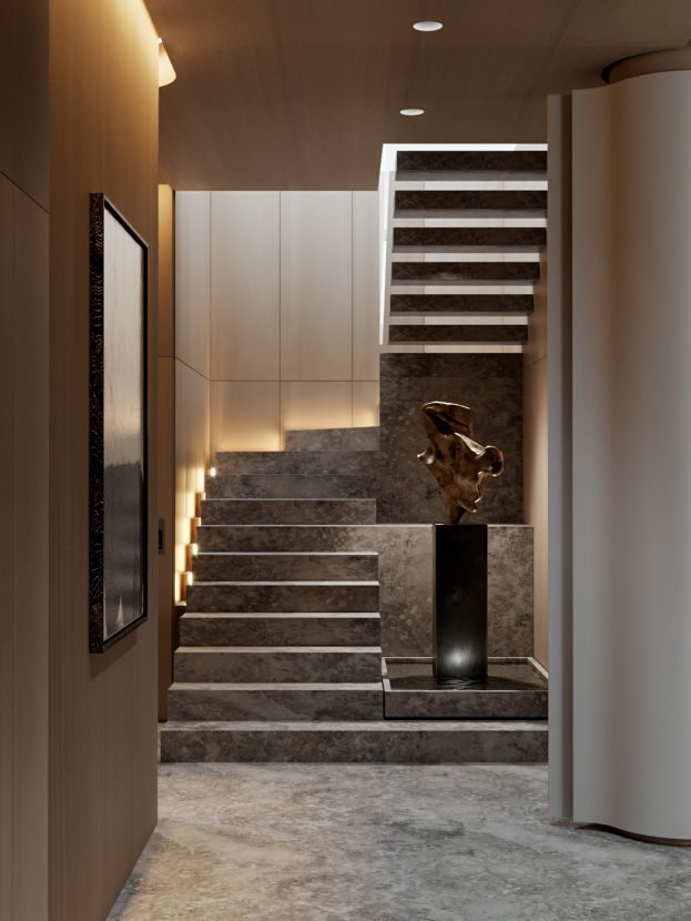 İç mekândaki zeytin ağacı, tasarımın merkezinde yer alarak mekâna güçlü bir ruh katıyor.