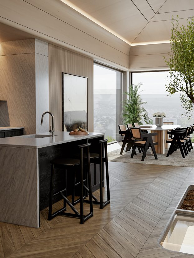 Panoramik şehir manzarasına hâkim bu villa, modern ve minimalist çizgileriyle doğa ve yaşamı bir araya getiriyor.