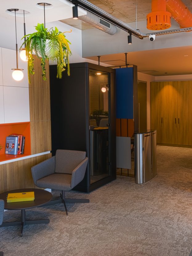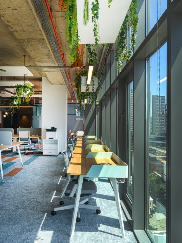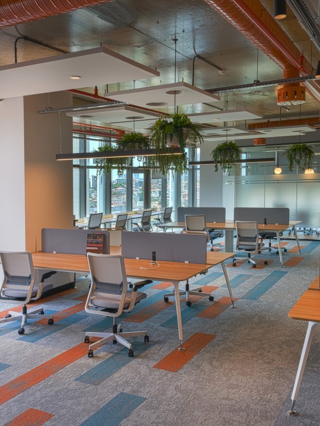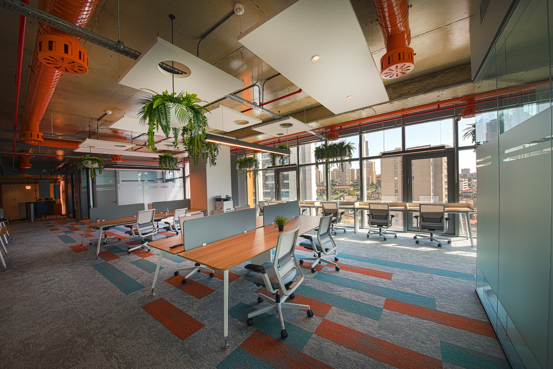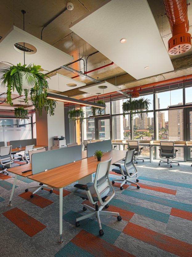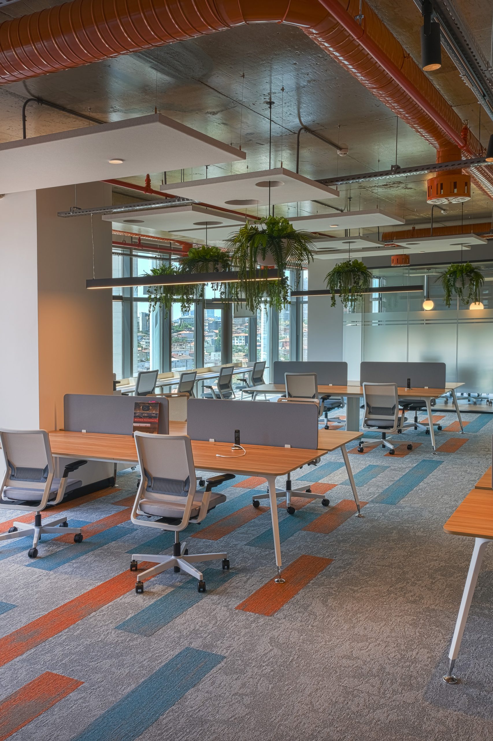 Doğal ışık kullanımı, akustik paneller ve bitkilendirme ile mekân, verimliliği artırırken kullanıcı konforunu da ön planda tutuyor.
